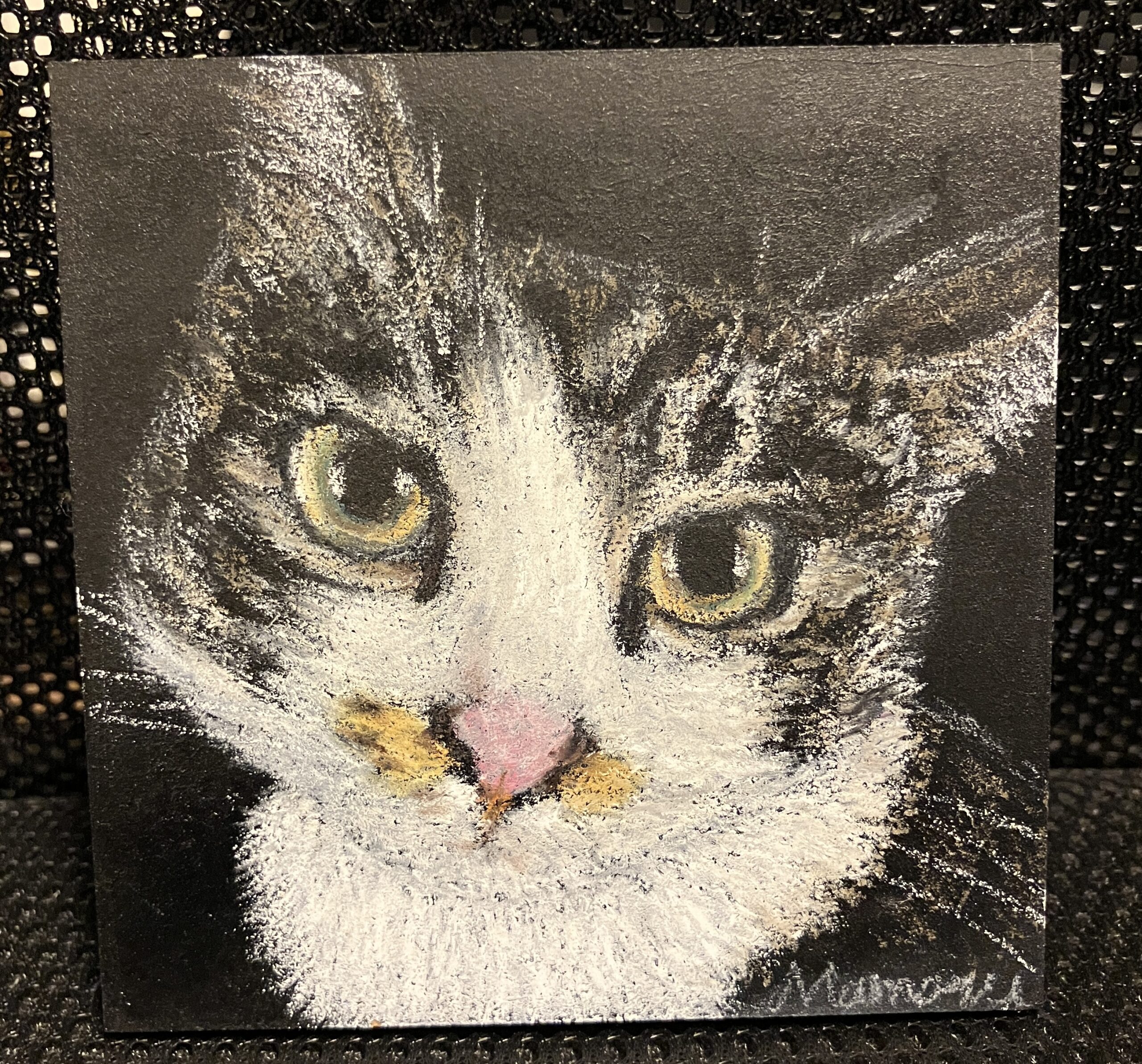 また、仕上げにスプレーで固定するため、触っても雨に濡れても消えません。黒い背景に色が映えるため、飲食店などの看板として非常に目を引きます。