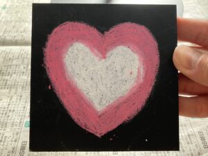 石灰を使うチョークではなく、オイルパステルというものを使う。 ・描くときのポイントとしては薄い色から入れていくこと。 ・はみ出てもあとでブラックペンシルで修正できる。 ・グラデーションは指の腹を使って境目の部分を撫でるように動かして作る。 ・指で混ぜすぎてムラができたり難しい時は、オイルパステルを上から塗り込んで調整する。 ・時々描いている絵を少し離して見てみる。 ・使った指やオイルパステルはウェットティッシュ、タオルで必ず拭いておく。