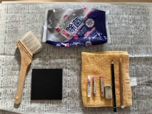 ・ブラックボード ・黒色鉛筆(ブラックペンシル) ・消しゴム ・ホワイトペンシル ・刷毛 ・タオル ・ウェットティッシュ ・新聞紙か汚れてもよい敷物 ・ラッカースプレー